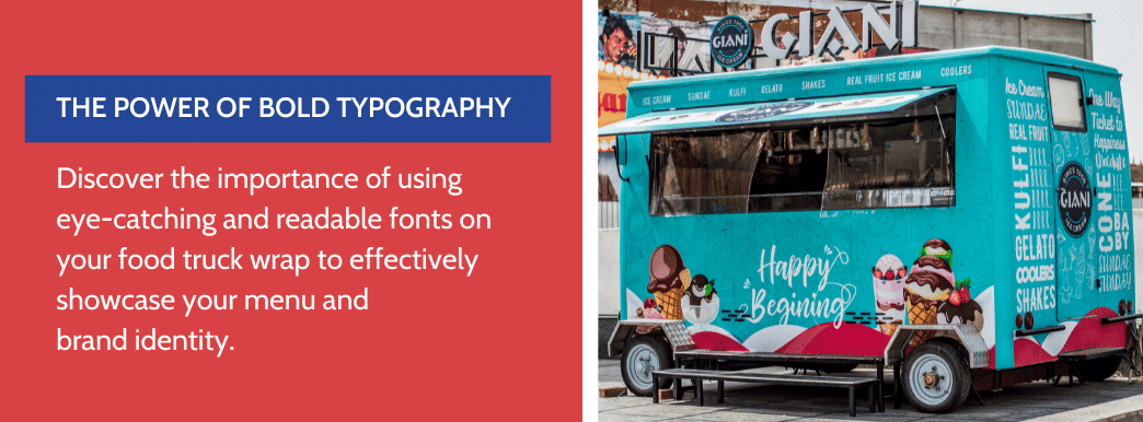 Creating a bold contrast is essential when designing your food truck wrap to attract customers because it makes it more readable and accessible. Utilizing high-contrast colors such as blue and white, black and yellow, or white on black can create an eye-catching look that will grab the attention of people searching for delicious grub options.