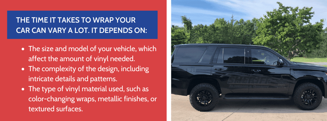 If you want a full wrap that includes tricky spots like door jambs, plan on waiting several days for the installation. This time is necessary to make sure the wrap looks perfect.