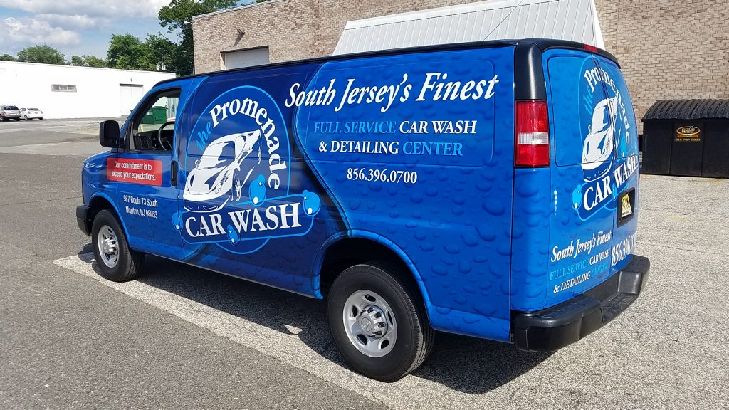 Blue and white designed van with "The Promenade Car Wash" text on car wrap.